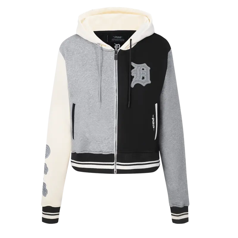 MLB DETROIT TIGERS REVERSE FRENCH TERRY WOMEN’S COLOR BLOCK FLEECE FULL ZIP HOODIE (BLACK\/GRAY\/EGGSHELL)